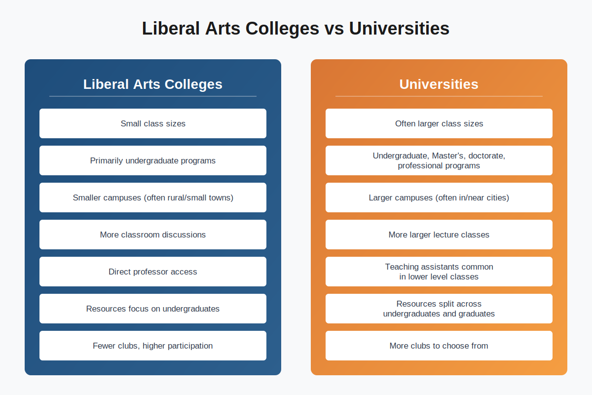 Key difference: Universities offer liberal arts PLUS pre-professional programs. Liberal arts colleges typically offer ONLY the liberal arts approach, although some re starting to offer business degrees or partnerships with other engineering colleges.